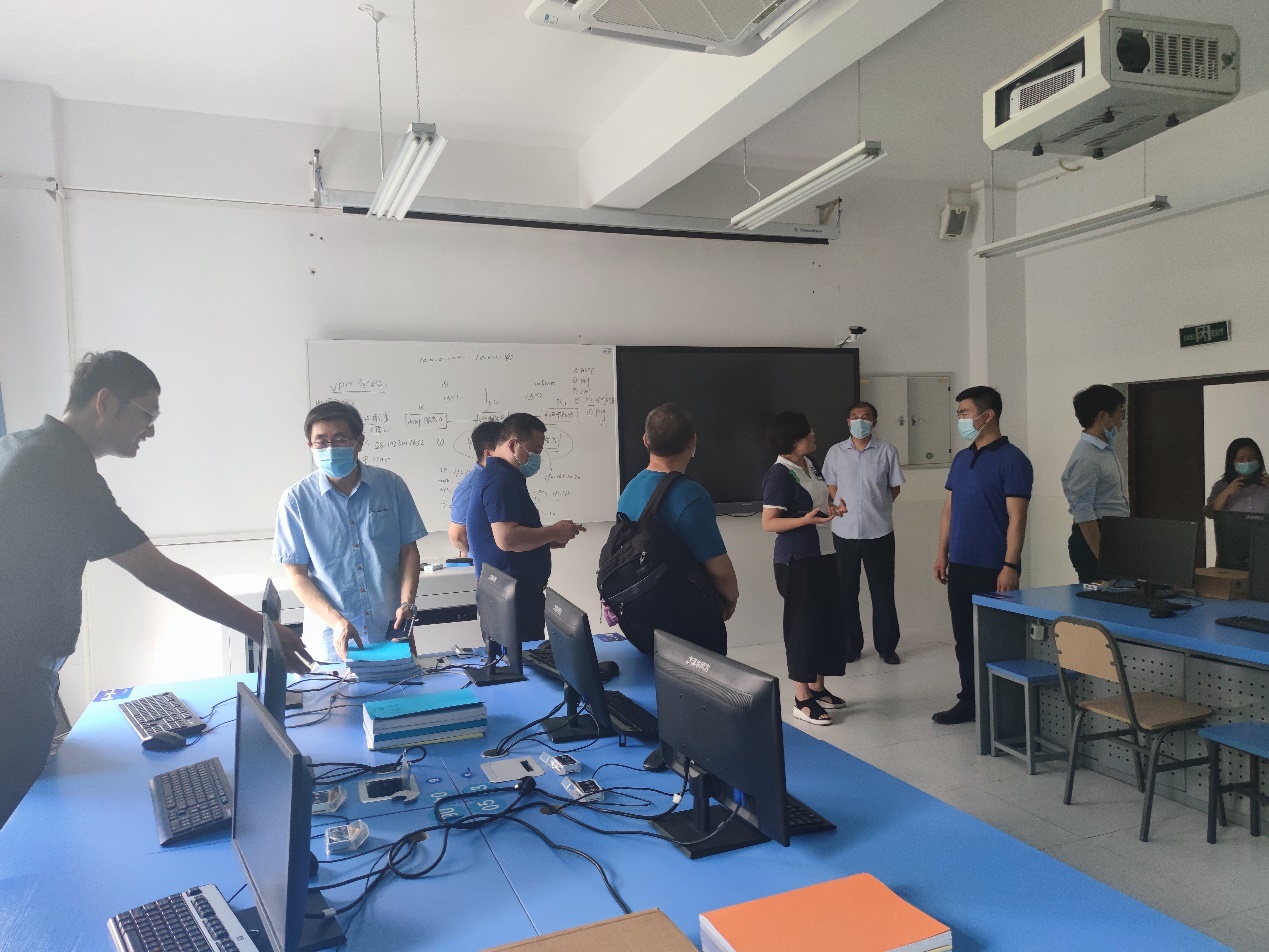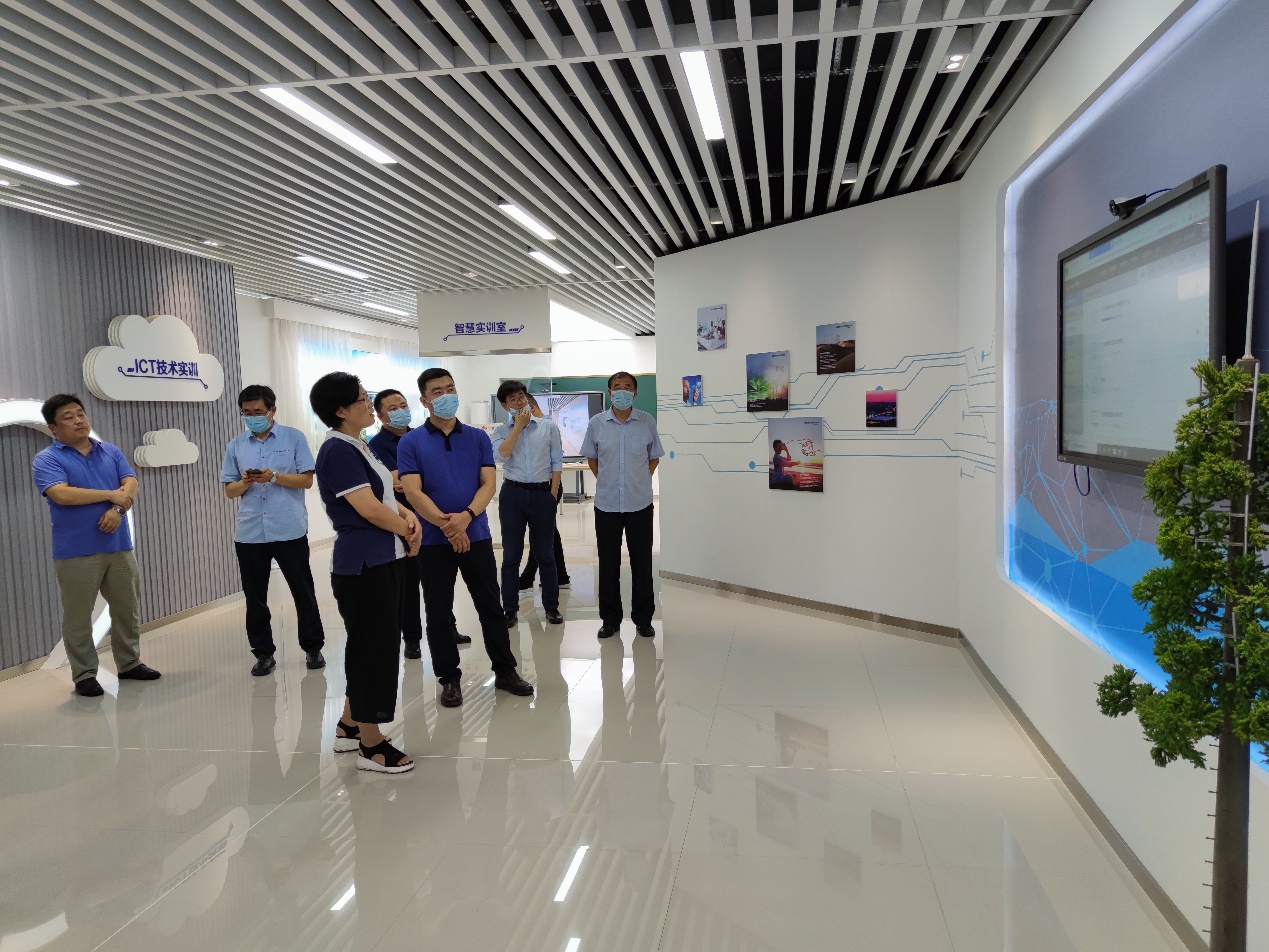 刘成俊副董事长首先代表公司对河北软件职业技术公司的到访表示了欢迎,并向来宾介绍了公司的团队、员工等基本情况,以及公司在科研、社会服务等方面的成果。乔哲副董事长就河北软件职业技术公司的情况也作了简要介绍,并希望在产教融合和校企合作等相关方面进行深入沟通和交流。陶亚雄经理向来宾分享了公司与华为技术有限公司在开展校企合作、专业与课程建设、人才培养等方面的做法与经验,并与来宾就双高建设、1+x培训及认证、产学研用社会服务等方面进行了深度的探讨。来宾们对于公司取得的各项成果给予了高度评价,并对此次交流探讨表示了由衷的感谢。座谈前,来宾们还参观了英国365上市公司智慧创新中心和英国365上市公司实训室。