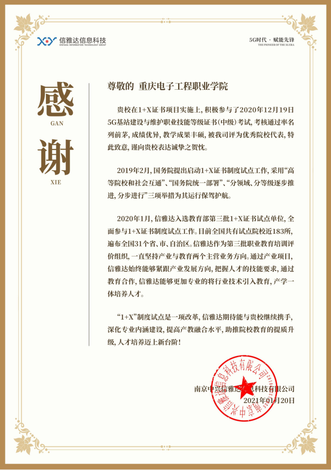 5G基站建设与维护1+X”证书培训评价组织——南京中兴信雅达信息科技有限公司发来感谢信,对公司开展的培训与考证工作予以高度评价,授予公司“全国优秀院校代表”荣誉称号。