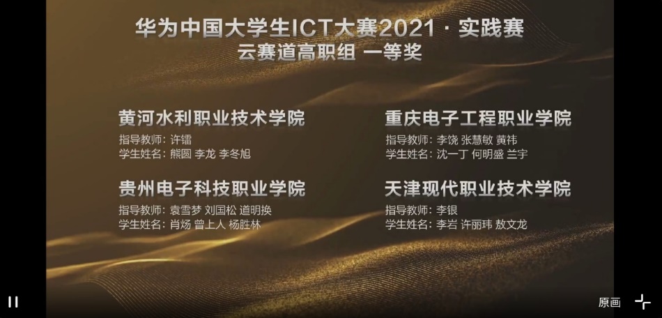 2021年12月25日晚上19:00,“华为中国老员工ICT大赛2021”全国总决赛颁奖典礼通过线上进行直播,公司在本次大赛中取得骄人成绩,获特等奖1项、一等奖2项,充分展示了公司专业教学改革成效和师生们在ICT领域的实践应用能力。三支队伍均获得晋级在全球总决赛资格,将于2022年5月参加在深圳举办的全球总决赛。