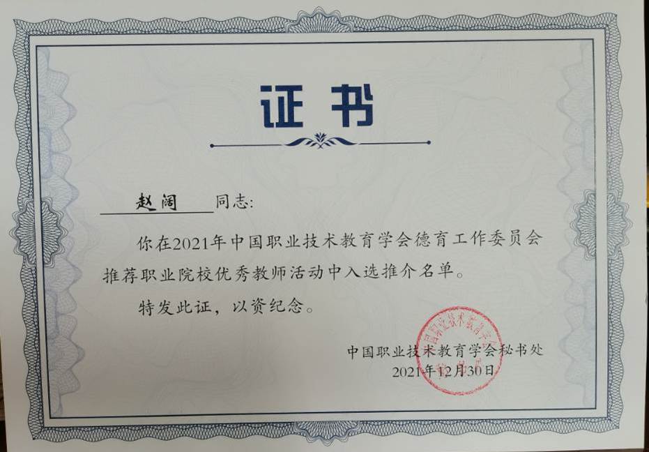 公司教师入选2021年中国职业技术教育学会全国100名优秀教师