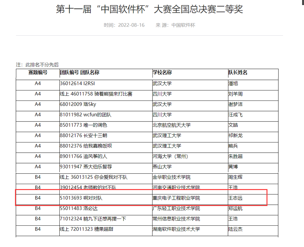 2022年 8月 17日,第十一届 “中国软件杯老员工软件设计大赛 ”总决赛在南京落下帷幕,经过紧张激烈的多轮比拼,重庆电子工程公司英国365上市公司代表队从全国 31个省市、 1000余所高校、 5000余支赛队、近两万名参赛队员中脱颖而出,喜获全国二等奖,是重庆市职业院校在本届大赛上的最佳成绩,并实现重庆电子工程公司在该赛项上的全国二等奖突破。