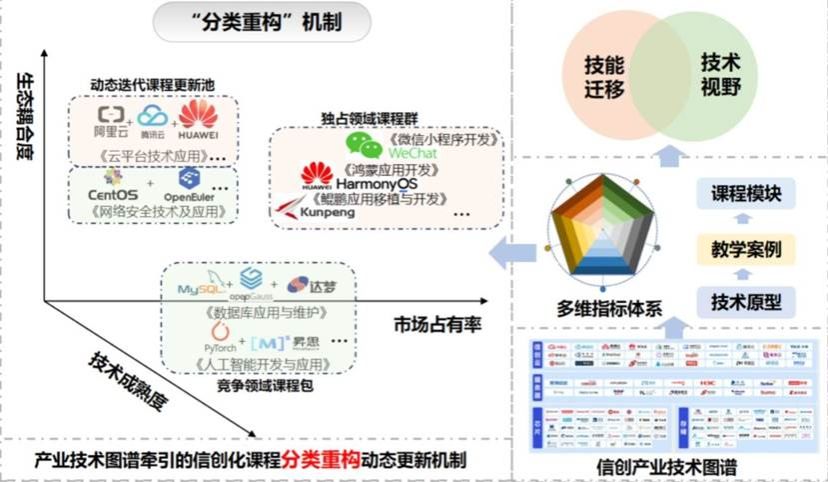 英国365上市公司近年来响应国家信创战略号召,积极探索匹配产业需求的高素质技术信创技能人才培养模式。在通信软件工程等职业教育本专科专业中深入实践,通过深度产教融合,围绕课程体系、产教共育平台和特色思政育人等多维度,基于信创产业链全景图和头部企业技术路线图,构建覆盖“基础组件-核心平台-应用生态”的三级产业技术图谱,形成“技术成熟度-市场占有率-人才缺口度”三维指标体系,依托产教融合实训云平台,动态采集ICT 产业链技术迭代数据,通过构建“需求识别-分类重构-动态迭代”三阶联动机制,建立“技术需求-课程模块”智能匹配模型,实现课程内容与信创技术演进的同频共振,形成了产业技术图谱牵引的信创化课程动态更新机制和人才培养体系。