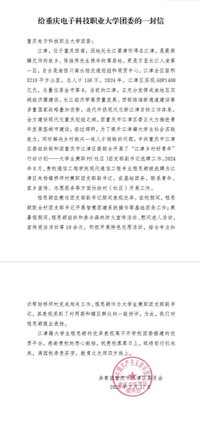 公司现代通信工程专业程思颖同学受到重庆市江津区团委表扬