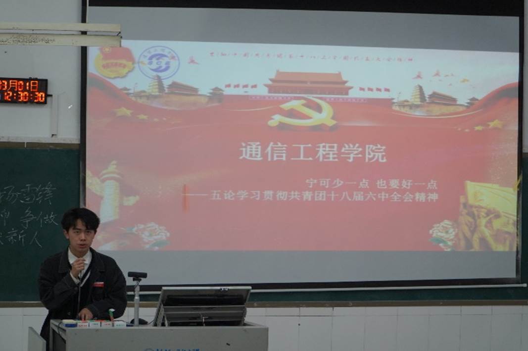 随后团总支·员工会主席团成员胡悦同学通过本次带领大家学习讲到团员的先进性关乎党、团组织的建设与发展。同时他用铿锵有力的语句强调团员不在数量而在质量,要加强团员自身的思想建设,希望各班团干部能落实宣扬共青团十八届六中全会精神,在未来的时间里以身作则,不断提升个人思想政治水平,努力成为优秀团员代表。