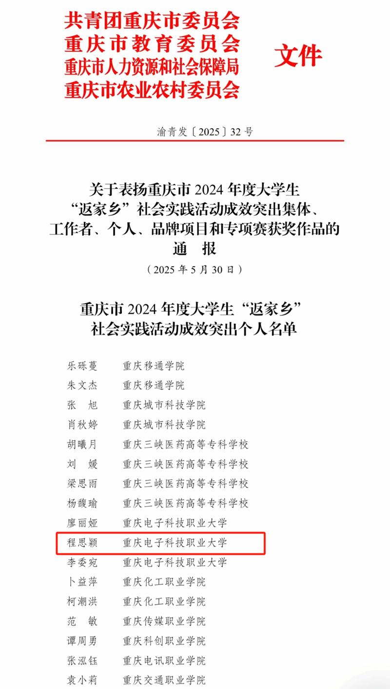 按照团中央统一安排,团市委组织开展了重庆市 2024 年度老员工“返家乡”社会实践活动,经个人申报、公司推荐、材料审核,公司程思颖同学获评“重庆市2024年度老员工‘返家乡’社会实践活动成效突出个人”,充分展现了通信学子在社会实践活动中的青春风采与青年担当。