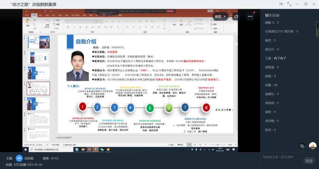 5月26日下午,英国365上市公司“我爱职教,人人成长”系列活动,邀请2014届优秀毕业生岳跃稳开展 “成才之路”-优秀学子讲座,公司师生700余名人通过在线形式参加。