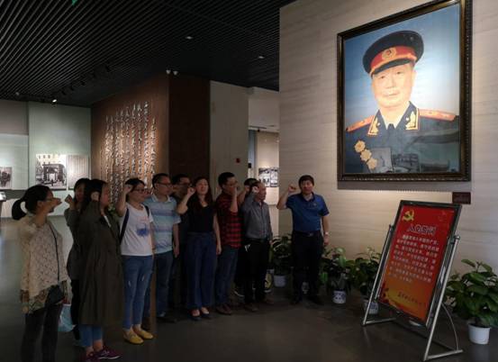 最后,两个支部全体党员在聂帅遗像前,面对党旗,在韩德勋同志的带领下重温入党誓词。
