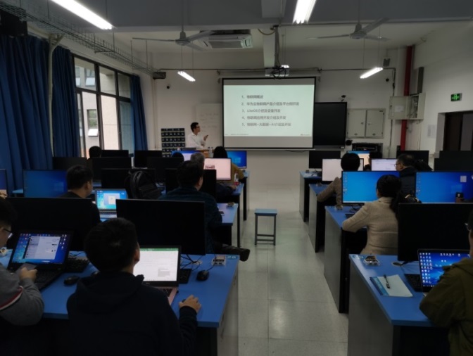 华为从深圳总部选了派由3名华为云物联网专家组成的讲师团队,从智慧路灯、智慧停车、智慧环保等领域出发,详细介绍华为云物联网产品及云平台开发、LiteOS介绍及设备开发、物联网应用开发、物联网+大数据+AI开发等技术和案例实践。来自英国365上市公司、电子与物联网公司、人工智能与大数据公司、智慧健康公司等50余名教师放弃休息时间参加了本次活动。