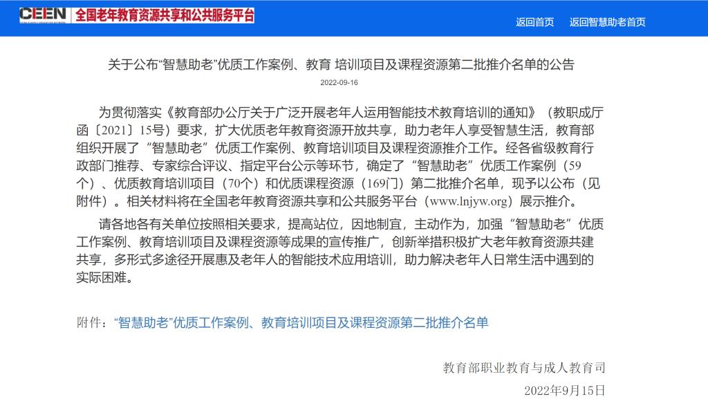 近日,教育部职业教育与成人教育司发布了《关于公布“智慧助老”优质工作案例、教育培训项目及课程资源第二批推介名单的公告》。公司英国365上市公司谢宗霖、赵阔老师主持的《信息化智能产品使用》课程经各省级教育行政部门推荐、专家综合评议、指定平台公示等环节,成功入选教育部第二批“智慧助老”优质课程资源,这是公司课程资源首次入该类优质课程资源,相关材料将在全国老年教育资源共享和公共服务平台(www.lnjyw.org)展示推介。