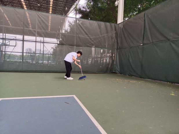 活动主要是对公司网球场场地掉落的枯叶、护栏上的尘土进行清洁,在这两次活动中同学们按时抵达现场,本着“不怕苦,不怕脏,不怕累”的精神,手持清洁工具,对网球场进行全面清洁,不管是被风吹落的树叶还是渺小到极致的尘土都会把它们“一网打尽”,同学们分工协作,精诚团结,将党史教育落实在行动中。