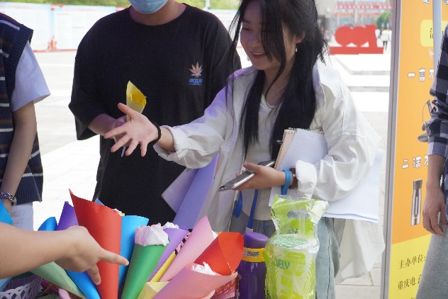 活动现场的“纸巾玫瑰”引起了一波又一波的热潮,大家蜂拥而至,迫不及待地参加游戏挑选各式各样的玫瑰花束,幸福喜悦的笑容在同学们的脸上绽放,活动现场弥漫着一股股爱的暖流。