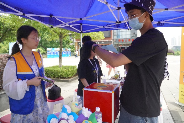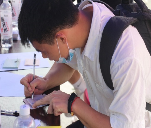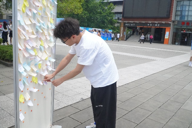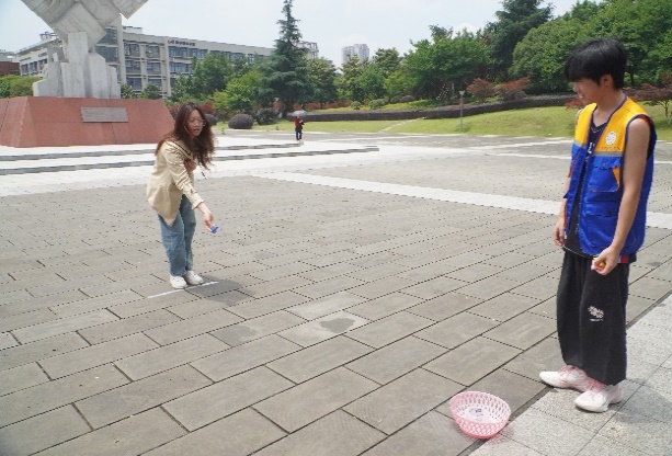 活动第三天,志愿者们在学子广场开展了玩游戏领花的活动。此活动首先需要同学们在便利贴上写下对自己、对朋友的寄语并贴在留言板上。然后,同学们可选择游戏方式,一是和志愿者石头剪刀布,三局两胜决胜负;另一个是在指定位置把沙包投进框,五中三便获胜,获胜者皆可进行抽奖,最后在指定位置兑换不同类别的“鲜花”。