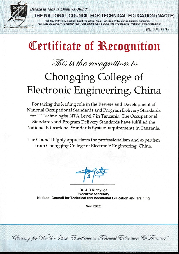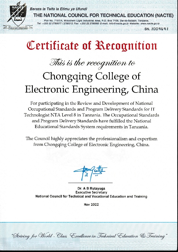 本次标准研制项目是公司牵头的中非职业教育联盟和中非(重庆)职业教育联盟联合组织的“中国职业院校在坦桑尼亚国家输出行业岗位职业标准以及配套人才培养方案项目”( 其中“人才培养方案”后改为“专业教学标准”);针对坦桑尼亚国家重点行业职业技能岗位,优选中国同等数量的职业技能岗位标准,经本土化修订后,按照坦桑尼亚国家相关流程注册认证,与配套专业教学标准一并纳入坦桑尼亚国家职业教育体系。公司最终获得信息技术工程师NTA 7(National Technical Award, 国家技能授予等级)级、信息技术工程师NTA 8级及配套专业教学标准的立项,并且作为整个信息技术NTA 4-8级的总统筹单位,协调各校开展信息技术行业4-8级的标准研制工作。